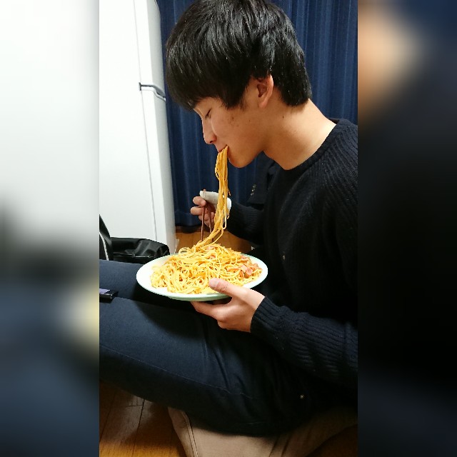 この写真は同期の吉井ちゃんが我が家で「五右衛門風ナポリタン」を食べている時のものです。